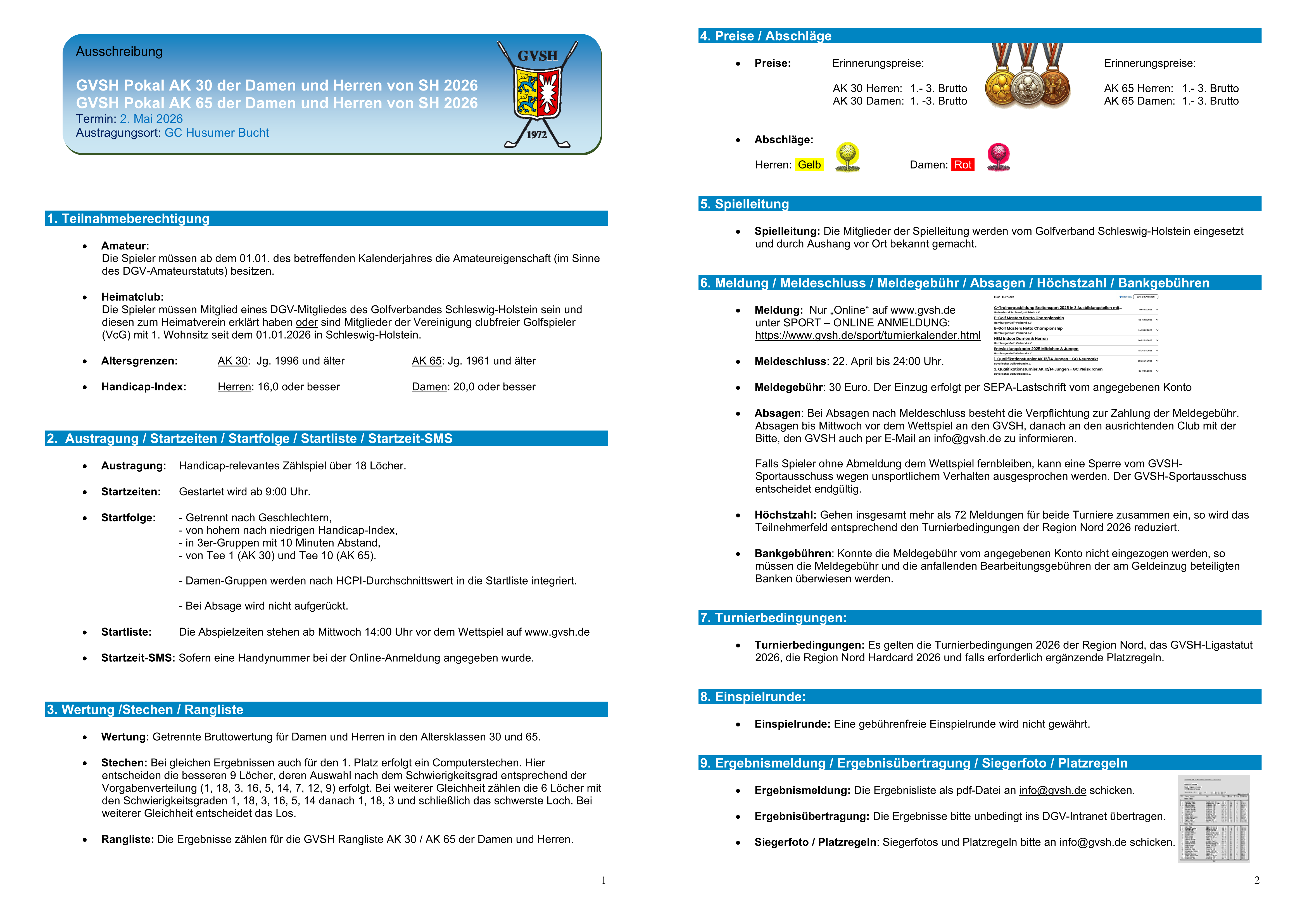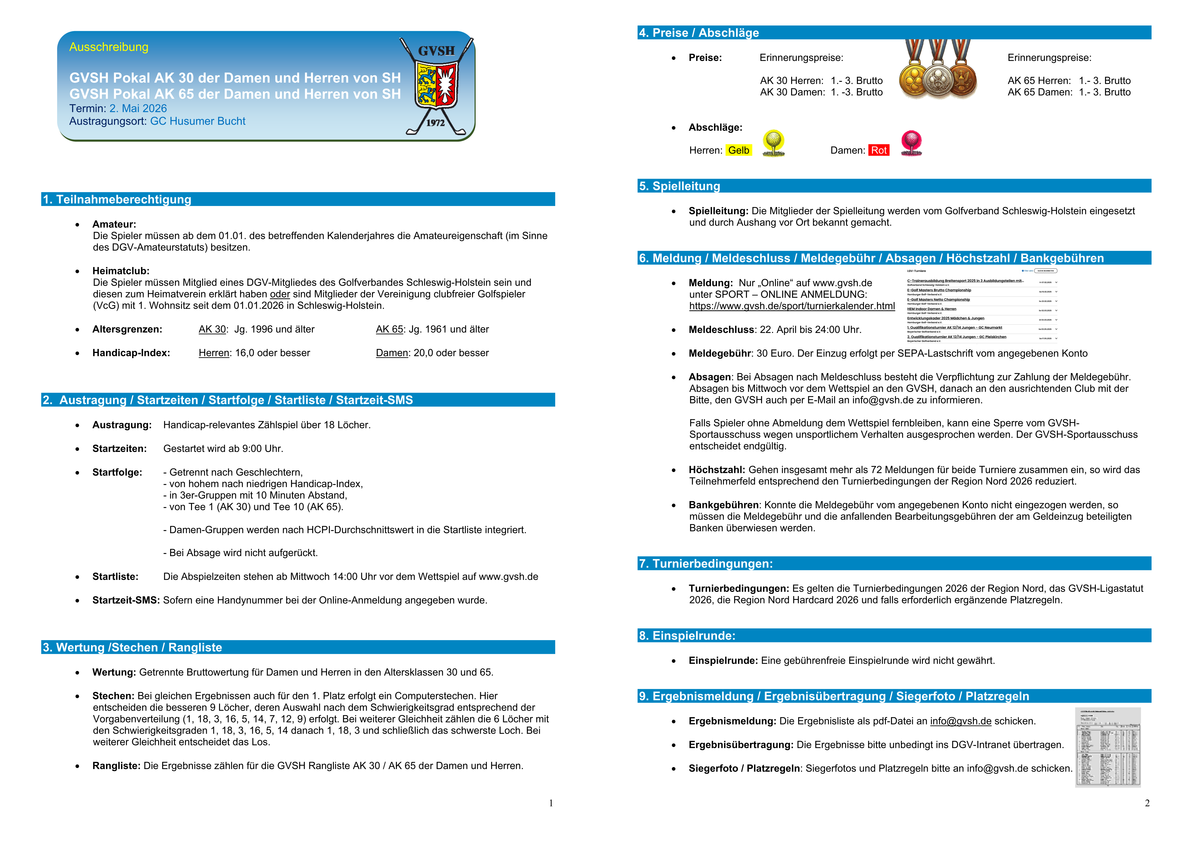 Ergebnisliste Brutto und Netto GVSH Pokal AK 30 Damen und Herren 2022