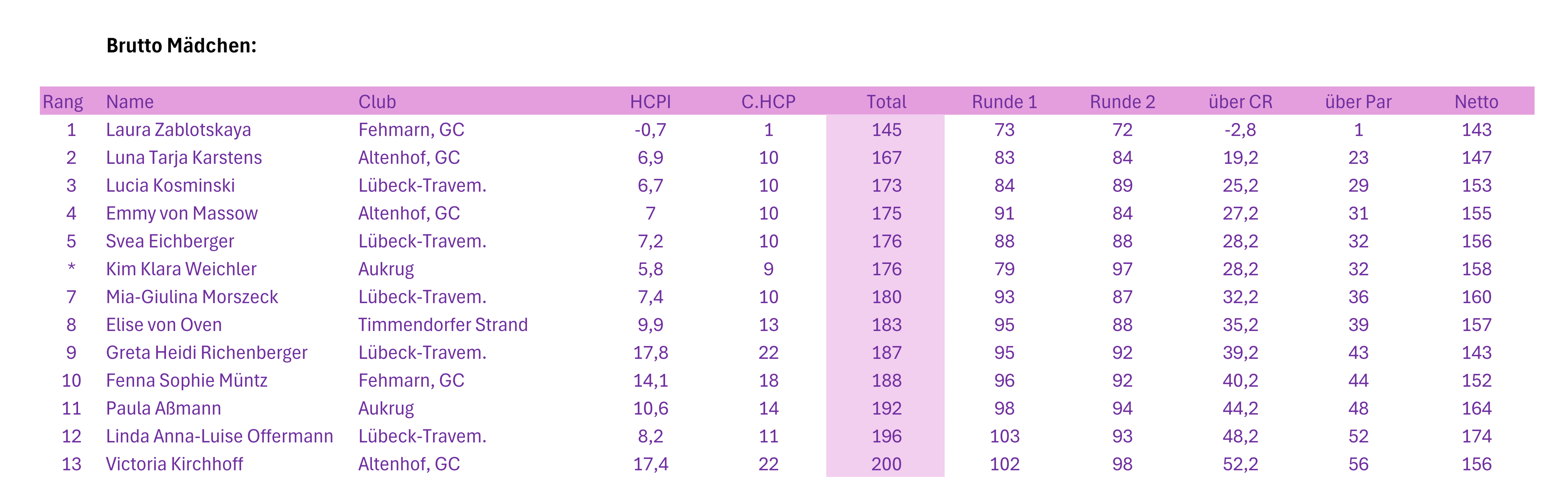 Bei den Mädchen gewann Edna Maxime Büll vom GC Altenhof erstmalig den Titel. Nach einer 84er Runde spielte sie am Sonntag eine starke 75 und gewann mit 2 Schlägen vor Mia Lena Hoffmann (GC Altenhof) und Elena Hansen (GC Lohersand). Philipa Gollan vom Lübeck-Travemünder GK konnte Ihren Titel nicht verteidigen, da sie am Sonntag konfirmiert wurde und so ihr 8 Schläge Vorsprung vom Samstag nach einer Runde von 74 Schlägen (ein Schlag unterspielt auf -0,9) leider verfiel.
