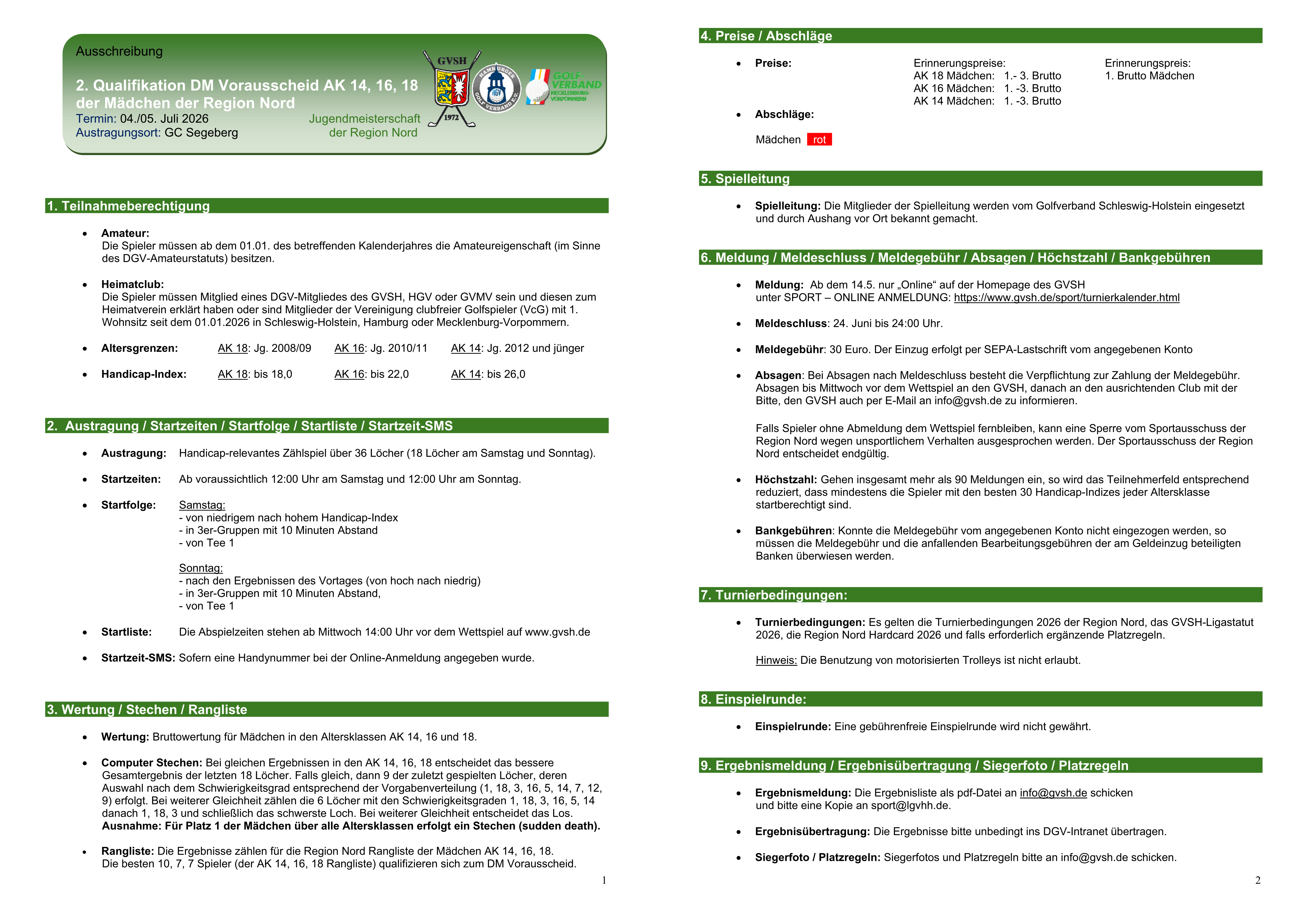 Die Jugendmeisterschaft der Region Nord (2. Qualifikation zum DM Vorausscheid) findet am 04. und 05. Juli 2026 statt.