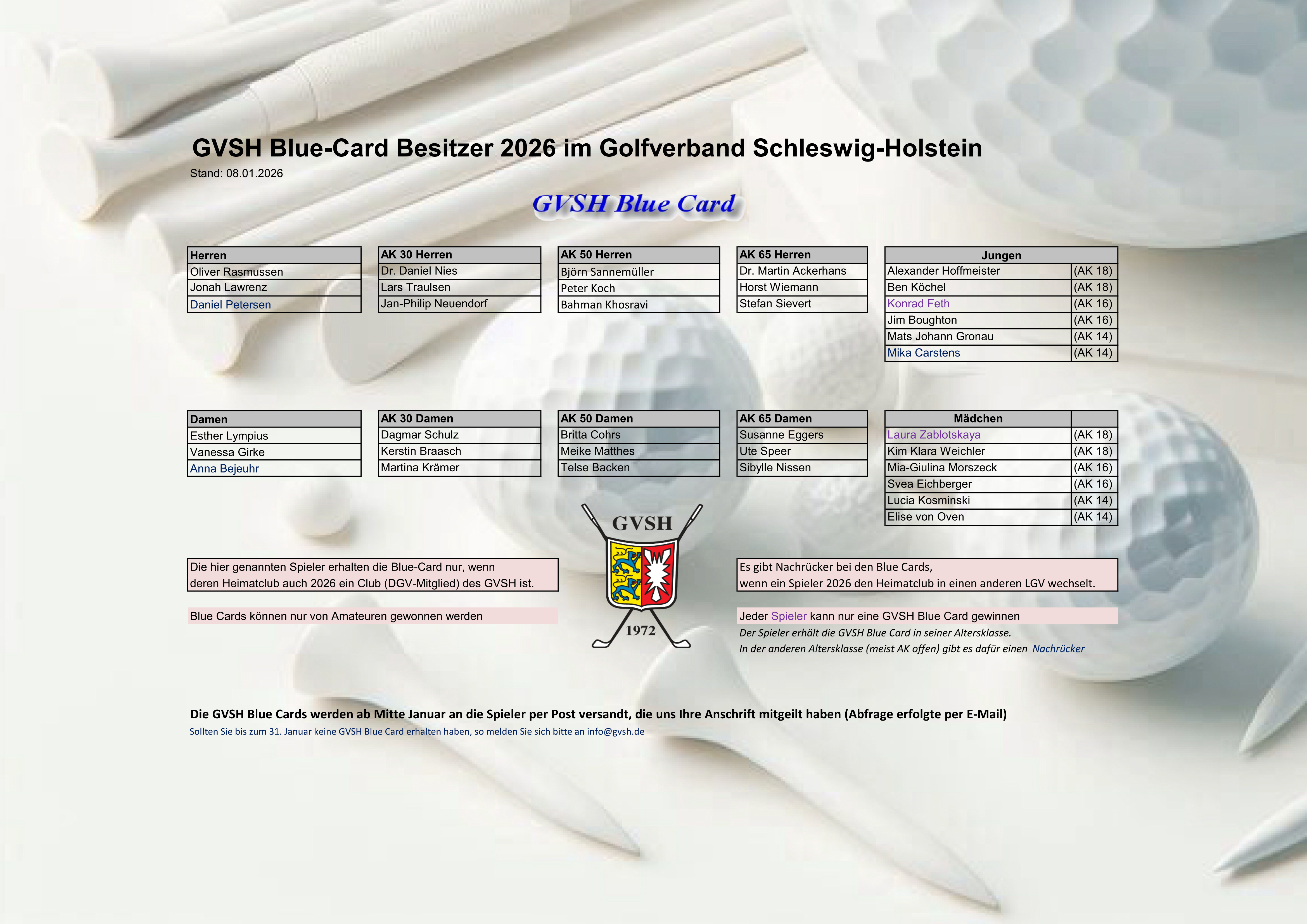 Die GVSH Blue Cards wurden am 13.01. per Post an die angegebenen Adressen der Spieler versandt. 3 GVSH Blue Cards wurden an die Heimatclubs GC Büsum Dithmarschen (Mika Carstens), LTGK (Konrad Feth) und FGC Glücksburg (Oliver Rasmussen) geschickt.